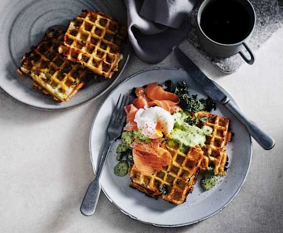 Chunky potato waffles with salmon and crispy kale